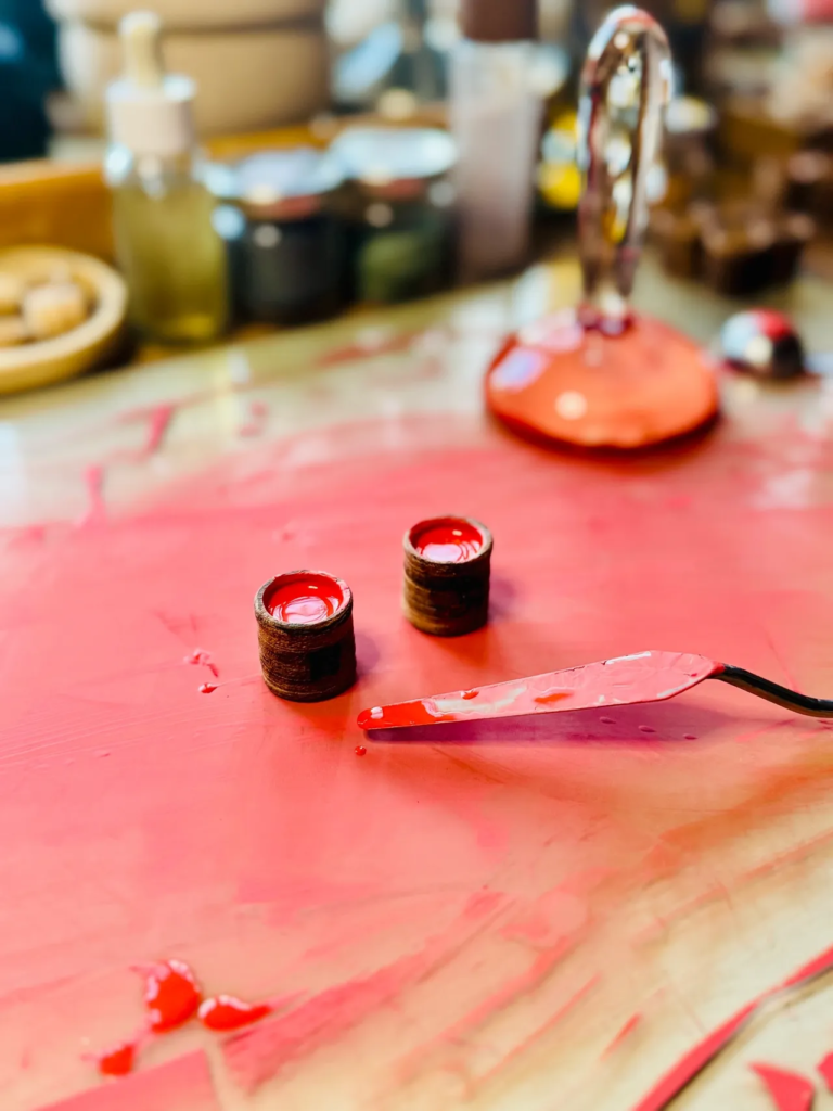 Travailler le cinabre, c’est manipuler une matière précieuse, réputée pour sa forte concentration pigmentaire (ceux qui l’ont essayé le savent 😏 . . . ).