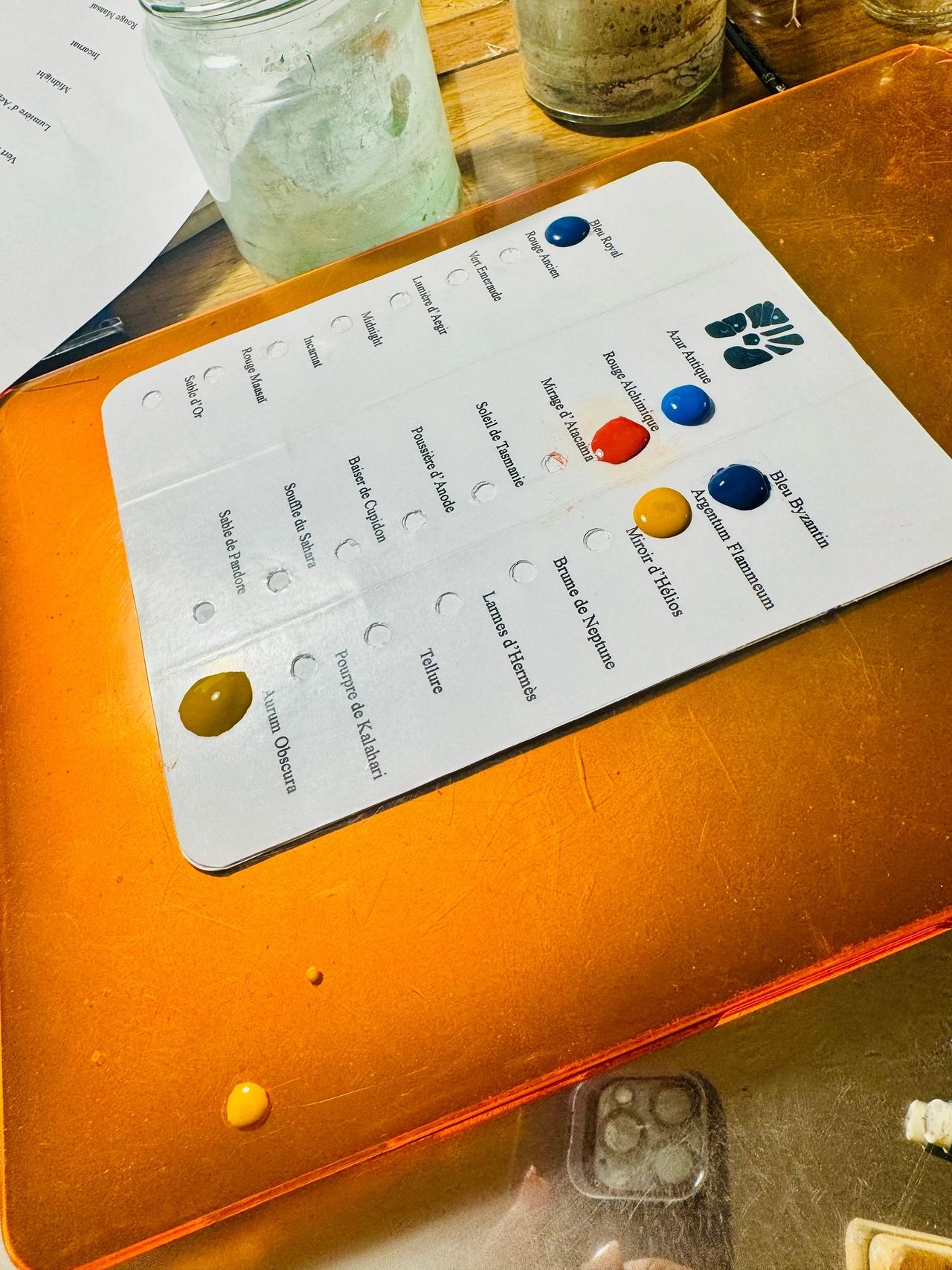 Nommer, c’est ma manière à moi de remercier la matière. De lui dire : “Tu existes, je te vois, et maintenant, tu as un nom.” Et c’est aussi ma manière de résister un peu au monde des “bleu n°3” et des “pigment code PB29”. Parce que soyons honnêtes : entre Bleu d’Ishtar et PB29, le cœur ne balance pas longtemps.